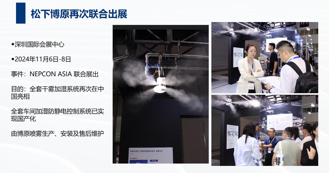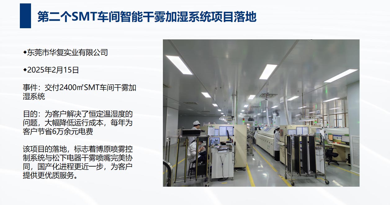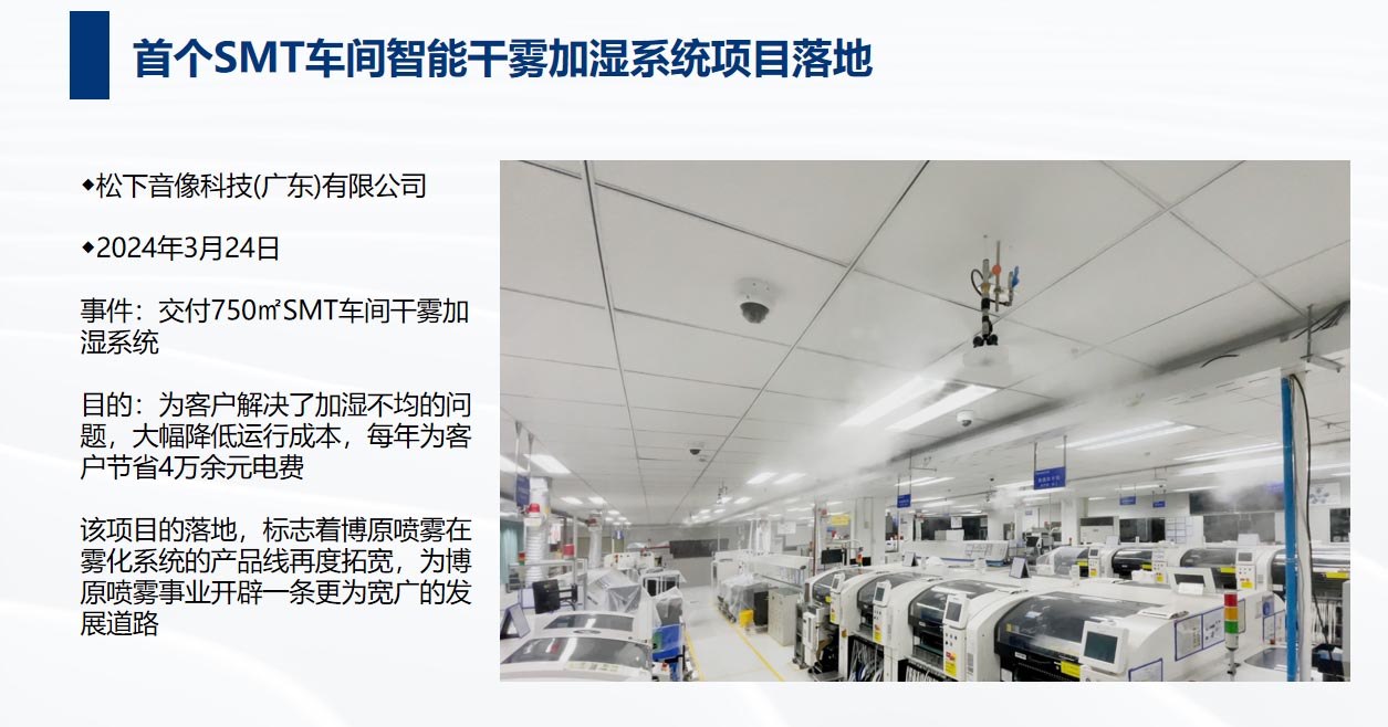 雙方于2023年簽訂MOU戰略合作協議,目前水霧項目穩定有序的開展,兩個SMT車間智能加濕項目完美落地,噴霧控制系統已實現國產化,后續雙方會持續優化產品及項目流程,為用戶提供更優質的服務。