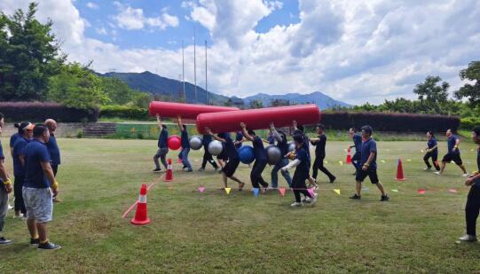 生活需要儀式感,工作需要歸屬感,在教練的組織安排下,分別組成6支隊伍,分別完成昂首挺胸、協力競走、開心麻花、十拿九穩、移花接木、打地鼠等一系列活動。