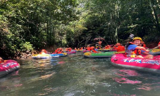 小伙伴們乘著皮艇順流而下,穿梭在蜿蜒流動的河溪中,四面青山環繞,漂流其間,迎面而來的涼風和水珠沖刷掉了夏日的酷熱。