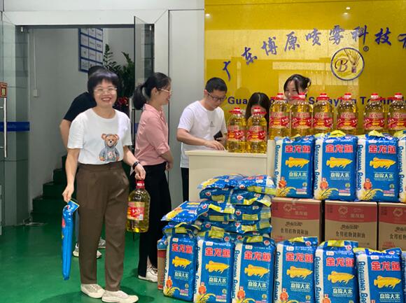 617日下午,一年一度的端午佳節來臨之際,為了讓博原噴霧所有員工度過一個祥和、愉快的傳統佳節,同時增強員工的幸福感、歸屬感,博原噴霧為全體員工準備了沉甸甸的金龍魚食用油和大米,飽含了公司對員工滿滿的節日關懷與深切祝福。