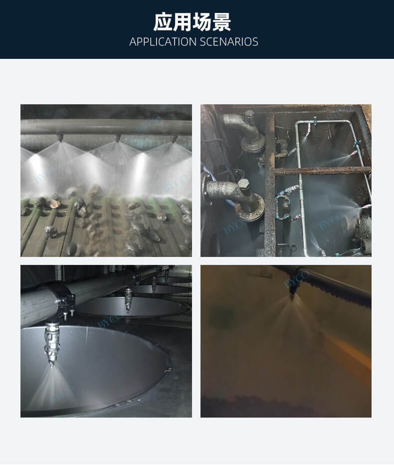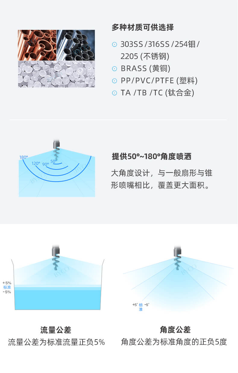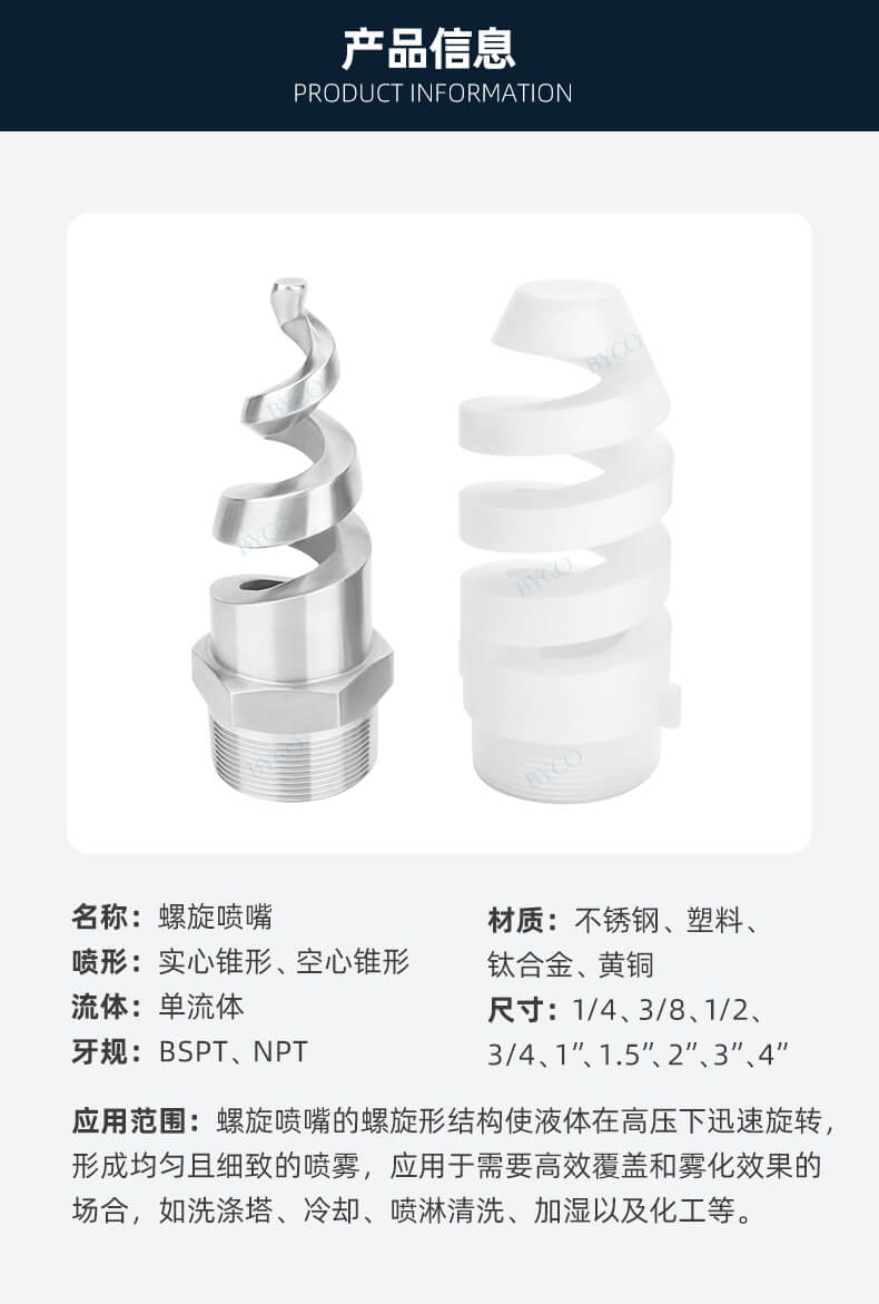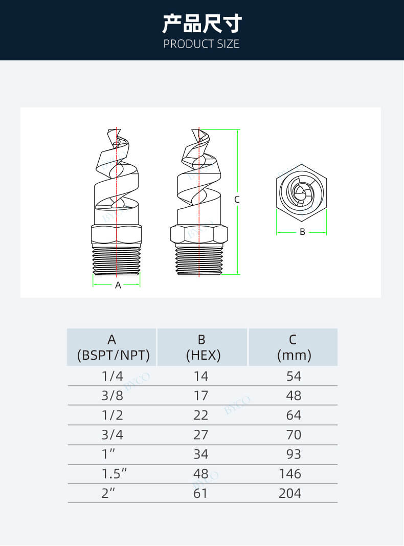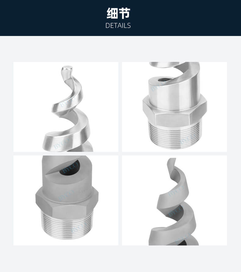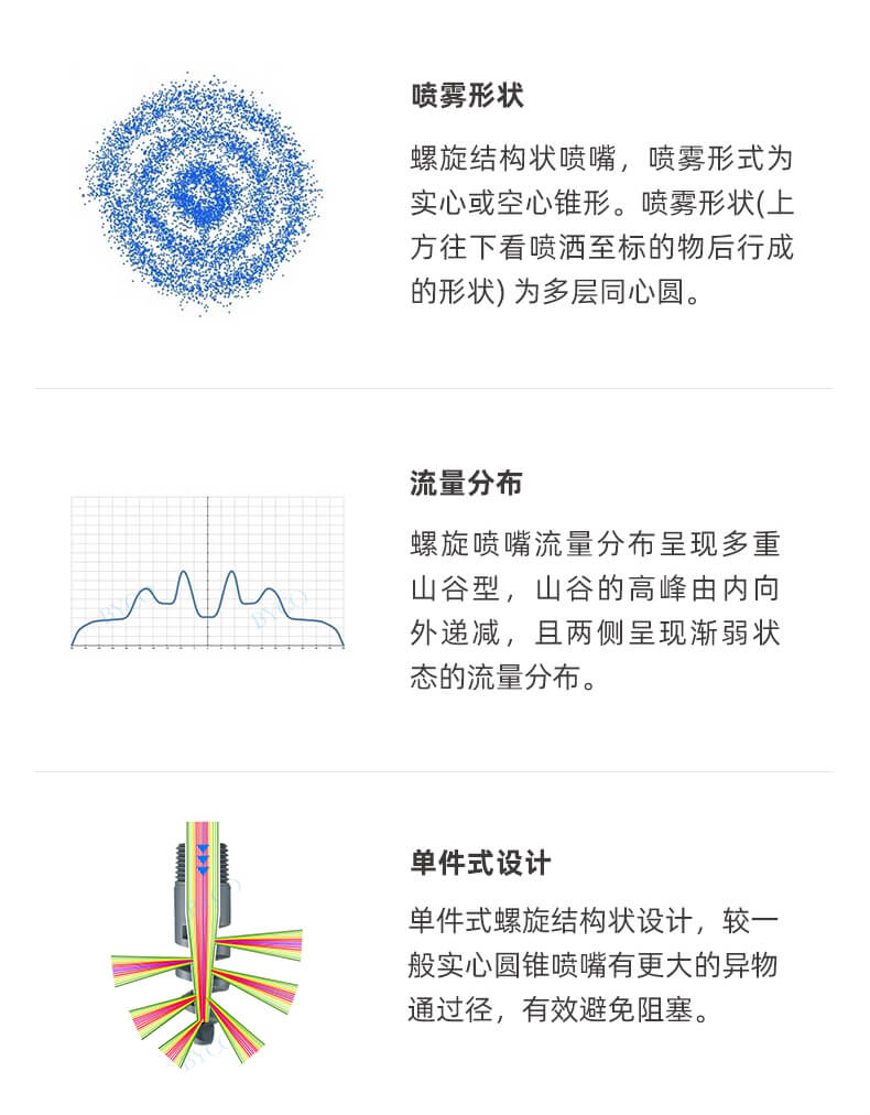 內(nèi)部為大流量通道設計,最大程度地減少液體阻塞。螺旋噴嘴產(chǎn)生實心(空心)錐形噴霧,液滴相對較為粗糙。