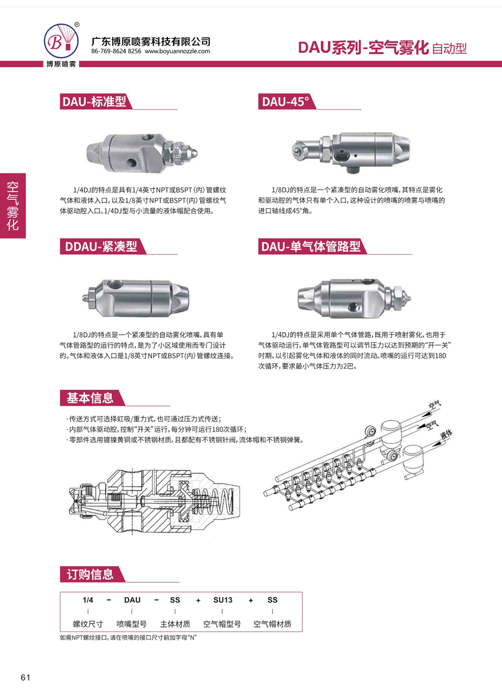DAU自動空氣霧化噴嘴,有一個內部氣體驅動腔用以控制開關運行。噴嘴的液體流可采用虹吸式、重力式或者壓力式傳送。所有噴嘴組件可采用鍍鎳黃銅或者不銹鋼制造。所有的噴嘴內部都有一個硬拉不銹鋼針閥,不銹鋼流體帽和不銹鋼回位彈簧。