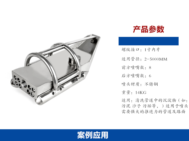 螺紋接口:1寸內牙,或者訂做噴嘴接口尺寸,重量14KG,適用管徑或路面:2-5000MM,主要適用于清洗管道中的沉淀物(如:污泥 沙子 污垢等,)適用于噴頭需要強大的推進力的管道及路面,噴頭材質為不銹鋼材質,噴嘴可更換。